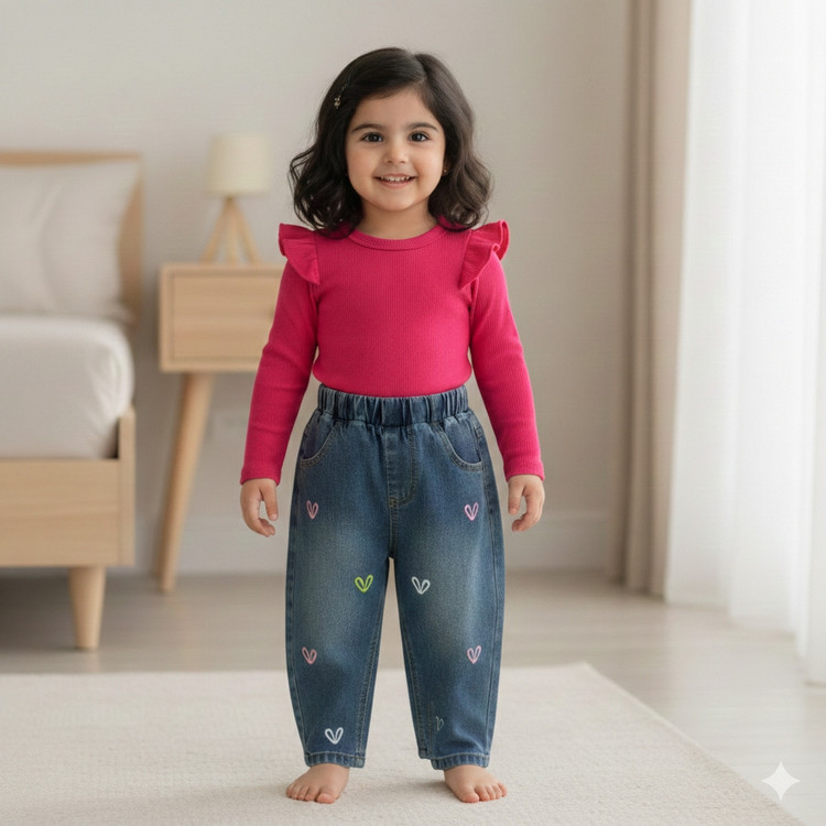 جین گلدوزی شده با طرح قلب و کمر کشی نرم و راحت که دقیقا مناسب کوچولوهای فعال و قشنگتونه 🏃♀️