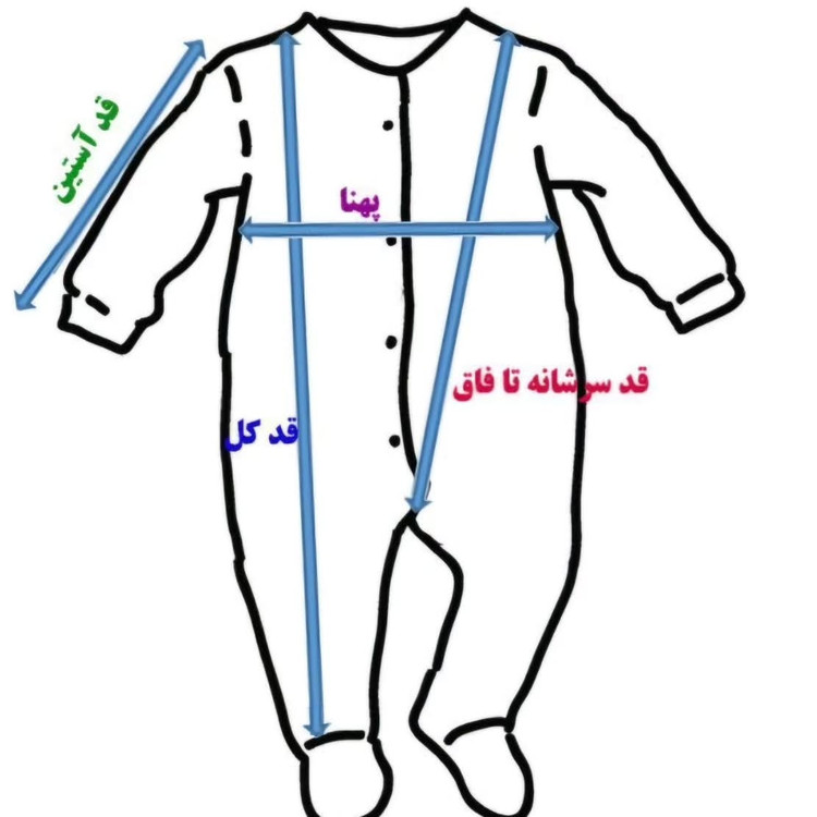 ۱_۲ماه: قد کل ۴۶، پهنا ۲۴، قد آستین ۲۲، قد سرشانه تا فاق ۳۰